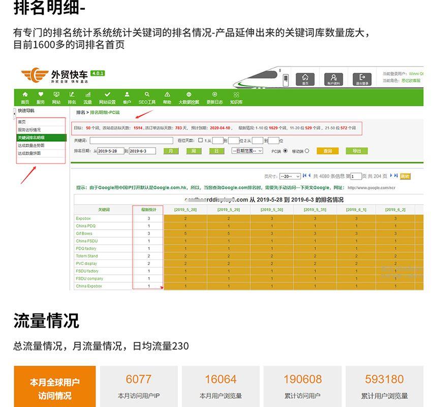 該公司是一家專業設計和制作各類紙貨架,紙貨架、紙展示架、獨立牌、包裝彩盒、促銷彩盒、促銷堆頭等POP展示用品公司,產品直銷國內和歐洲、北美、東南亞等地區。終端展示類紙制品以其環保低耗、成本價廉、絢麗多姿、裝運輕便,使用方便,促銷效果顯著等優點在國外發達地區已發展為主要的終端展示用制品,國內市場中該類制品業正逐步被各大中型日用品,冷飲和服裝品牌企業股份使用!一次性簽約外貿快車3年服務,共計拓展了4000多個產品相關關鍵詞,目前已有1600多個關鍵詞排名在谷歌首頁,這些關鍵詞每天可為該網站帶來200多個流量,客戶共計收到近2000個詢盤。