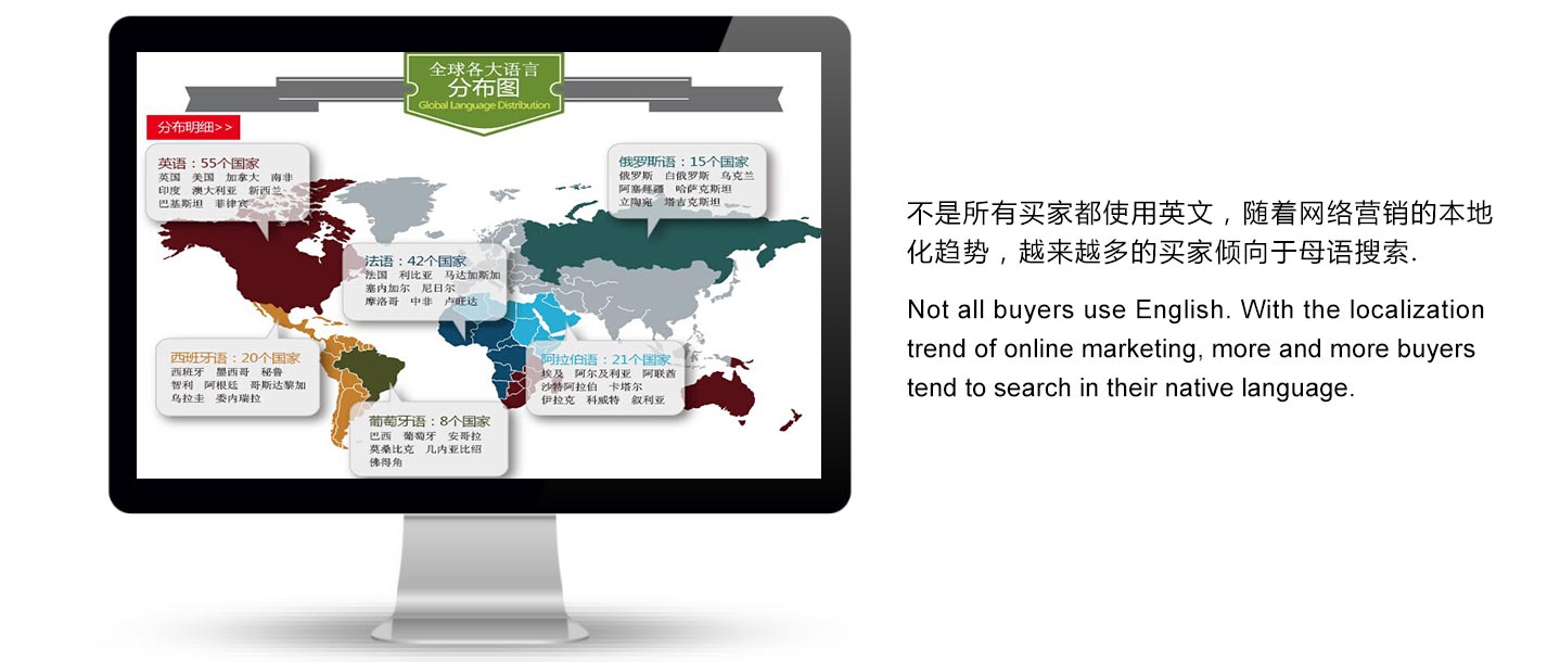不是所有買家都使用英文,隨著網絡營銷的本地化趨勢,越來越多的買家傾向于母語搜索